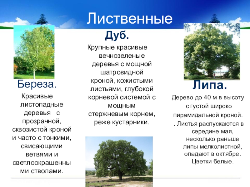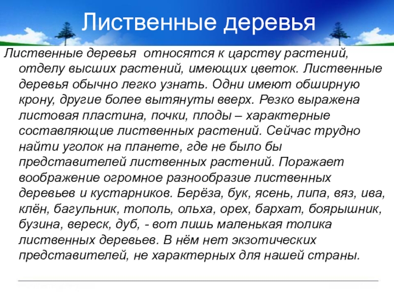 имеющих цветок. Лиственные деревья обычно легко узнать. Одни имеют обширную крону, другие более вытянуты вверх. Резко выражена листовая пластина, почки, плоды – характерные составляющие лиственных растений. Сейчас трудно найти уголок на планете, где не было бы представителей лиственных растений. Поражает воображение огромное разнообразие лиственных деревьев и кустарников. Берёза, бук, ясень, липа, вяз, ива, клён, багульник, тополь, ольха, орех, бархат, боярышник, бузина, вереск, дуб, - вот лишь маленькая толика лиственных деревьев. В нём нет экзотических представителей, не характерных для нашей страны.