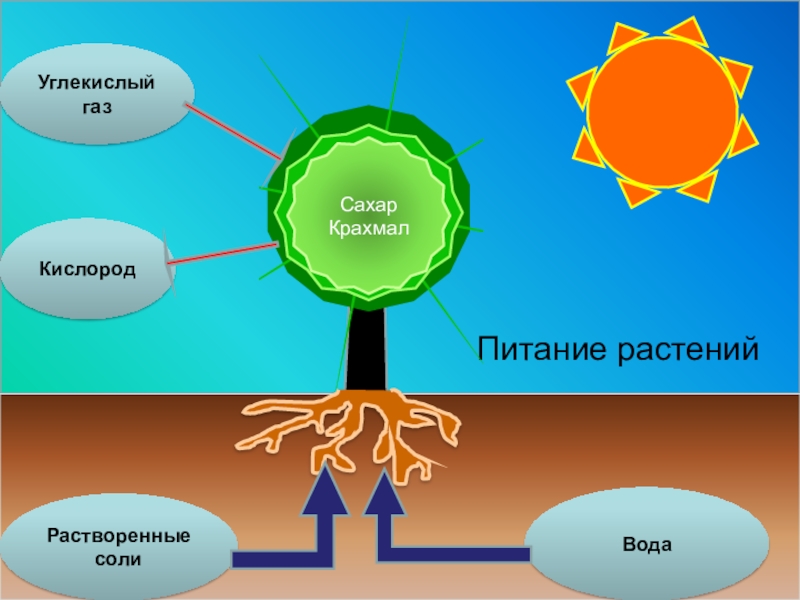 существо, дышит и вдыхает кислород, а выдыхает углекислый газ. Кислород «вдыхают» листья через маленькие отверстия на листовых пластинах – устьица. Устьица, как правило, располагаются на нижней части листовой пластины. Но могут быть и сверху. Так, например, у водяных лилий листья плавают на воде. Поэтому растение дышит верхней стороной листа, где и расположены устьица. Растение получает кислород как в воздухе (с помощью листьев), так и под землей (с помощью корней). «Выдыхается» углекислый газ в воздух и под землю. Из почвы растение с помощью корней получает воду и растворенные в ней соли. Но растению для нормального развития и роста требуется еще сахар крахмал. Этих веществ в почве нет.