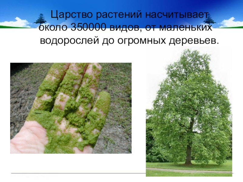 Слайд 8 Царство растений насчитывает около 350000 видов, от маленьких водорослей до огромных