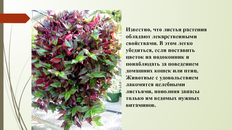 если поставить цветок на подоконник и понаблюдать за поведением домашних кошек или птиц. Животные с удовольствием лакомятся целебными листьями, пополняя запасы только им ведомых нужных витаминов.