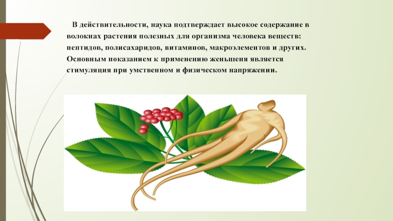 полезных для организма человека веществ: пептидов, полисахаридов, витаминов, макроэлементов и других. Основным показанием к применению женьшеня является стимуляция при умственном и физическом напряжении.