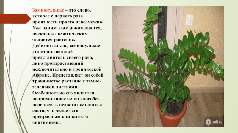 Слайд 10Замиокулькас – это слово, которое с первого раза произнести просто невозможно.