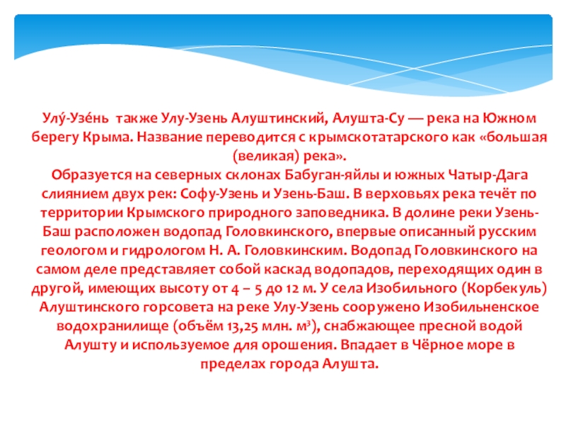 Слайд 12Улу́-Узе́нь также Улу-Узень Алуштинский, Алушта-Су — река на Южном берегу Крыма.