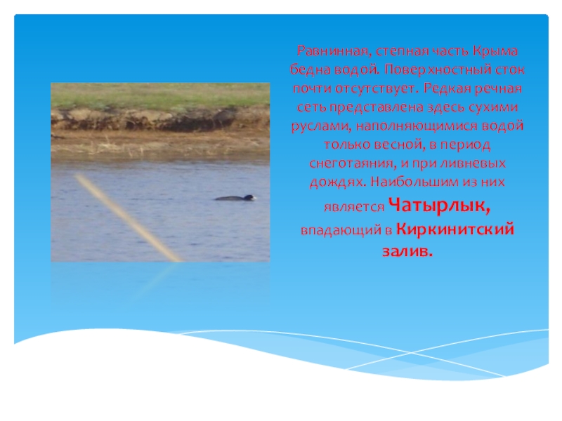Слайд 6Равнинная, степная часть Крыма бедна водой. Поверхностный сток почти отсутствует. Редкая