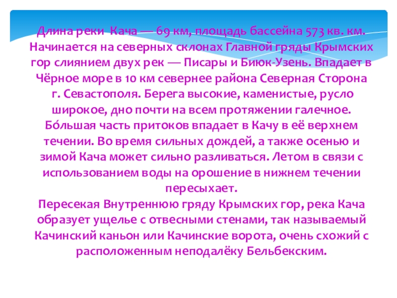 Слайд 20Длина реки Кача — 69 км, площадь бассейна 573 кв. км.