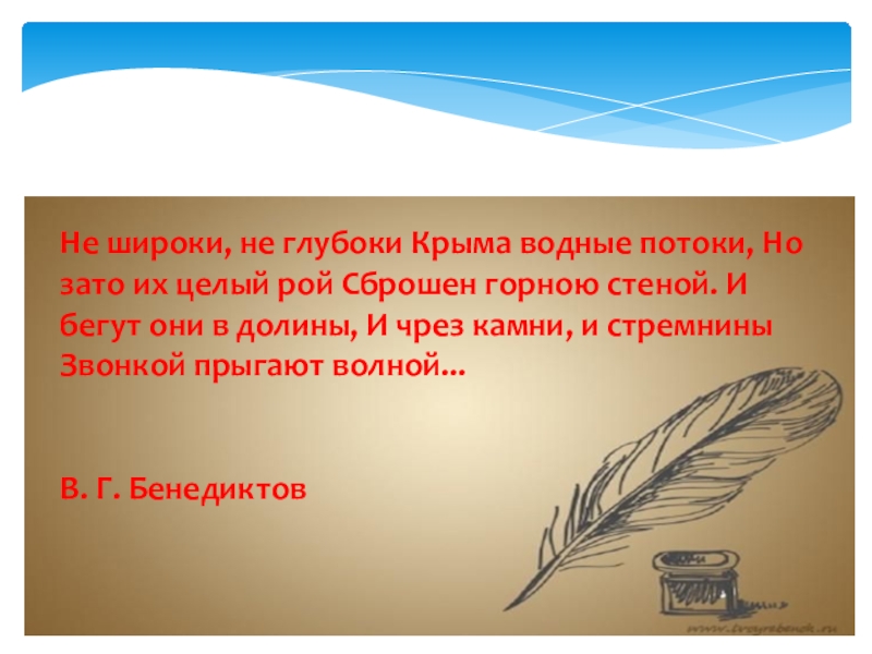 Слайд 2Не широки, не глубоки Крыма водные потоки, Но зато их целый