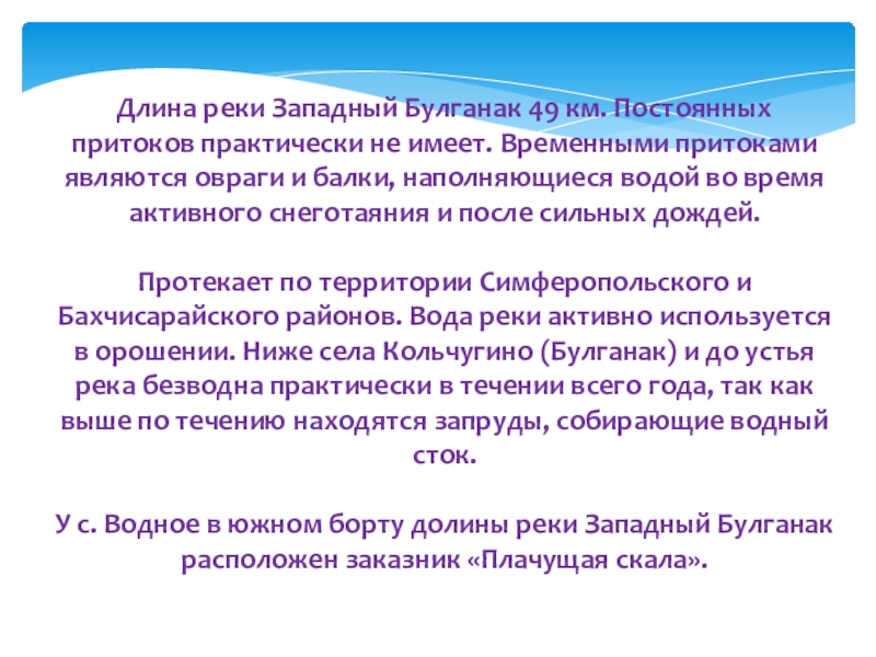 Слайд 24Длина реки Западный Булганак 49 км. Постоянных притоков практически не имеет.