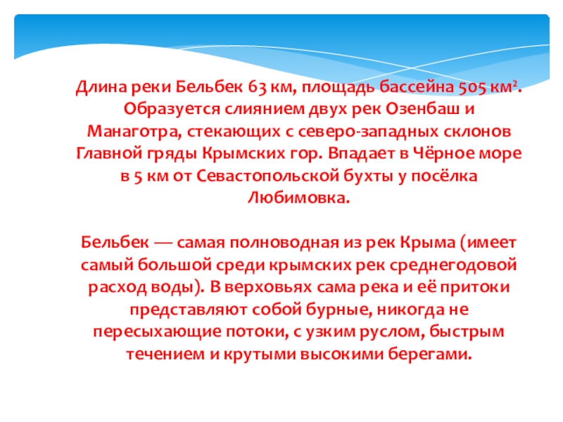 Слайд 18Длина реки Бельбек 63 км, площадь бассейна 505 км². Образуется слиянием