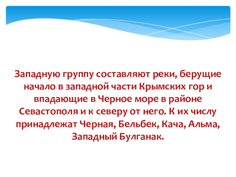 Слайд 14Западную группу составляют реки, берущие начало в западной части Крымских гор