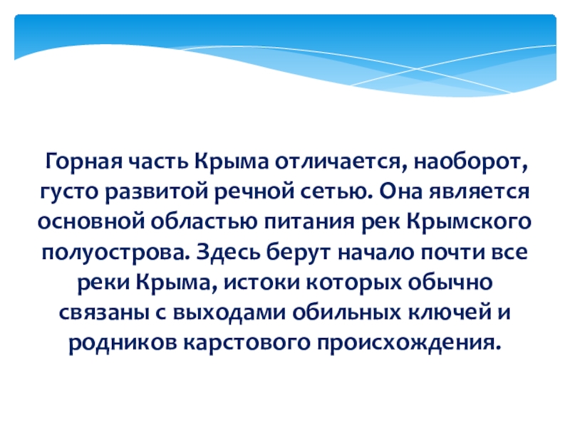 Слайд 7 Горная часть Крыма отличается, наоборот, густо развитой речной сетью. Она