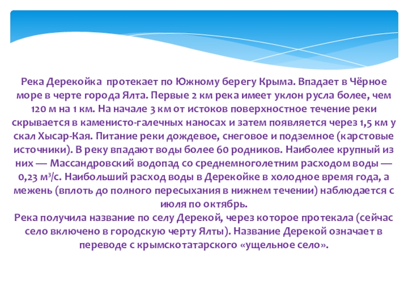 Слайд 10Река Дерекойка протекает по Южному берегу Крыма. Впадает в Чёрное море