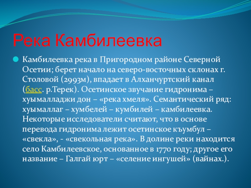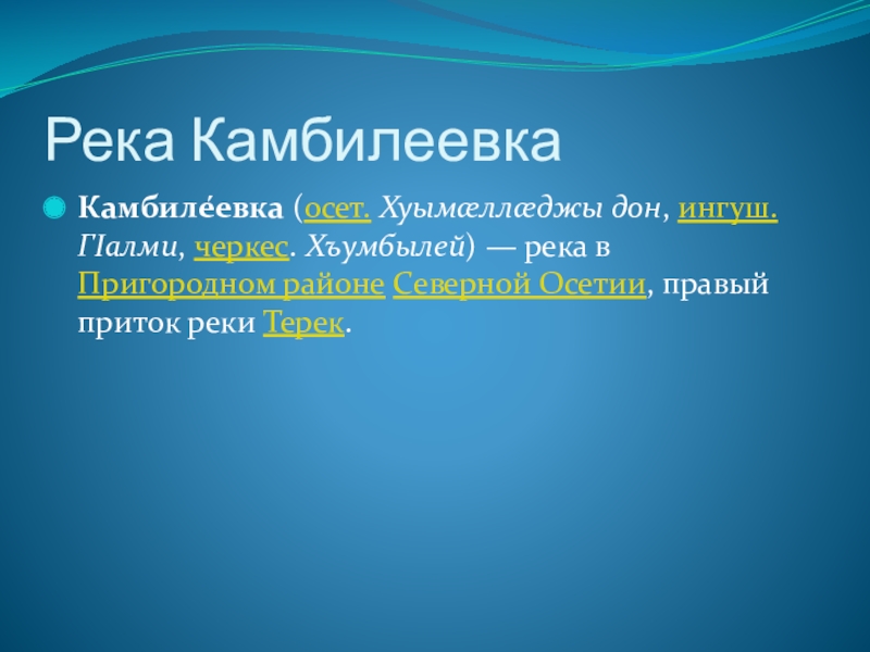 Река КамбилеевкаКамбиле́евка (осет. Хуымæллæджы дон, ингуш. ГIалми, черкес. Хъумбылей) — река в Пригородном районе Северной Осетии, правый приток