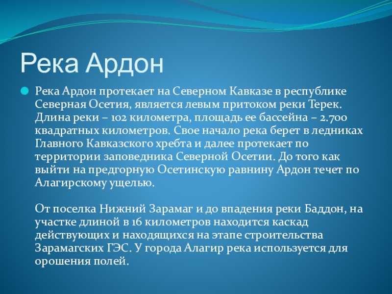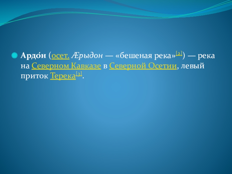 Слайд 15Ардо́н (осет. Æрыдон — «бешеная река»[2]) — река на Северном Кавказе в Северной