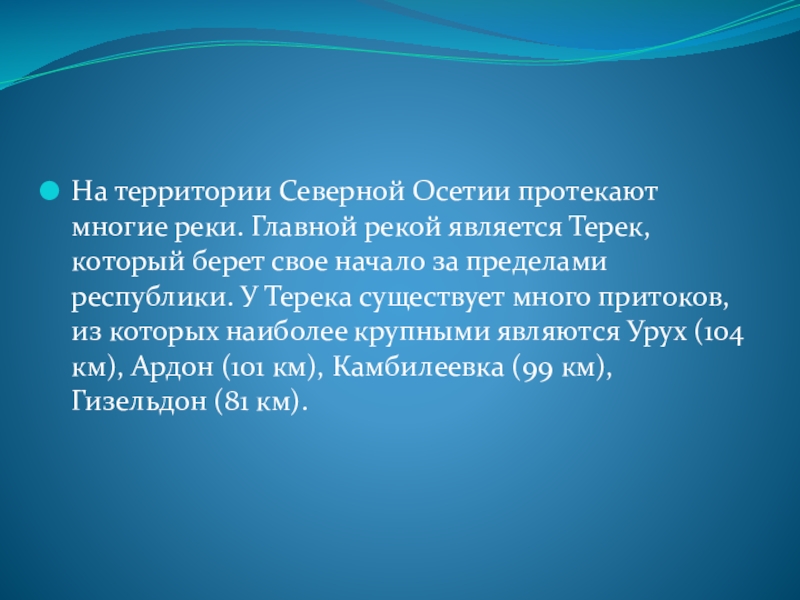 который берет свое начало за пределами республики. У Терека существует много притоков, из которых наиболее крупными являются Урух (104 км), Ардон (101 км), Камбилеевка (99 км), Гизельдон (81 км).