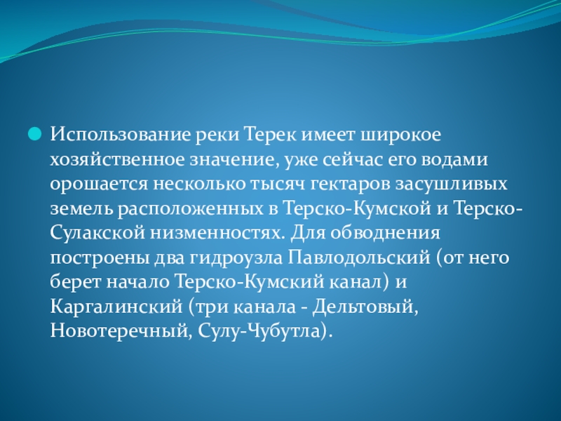 Слайд 13Использование реки Терек имеет широкое хозяйственное значение, уже сейчас его водами