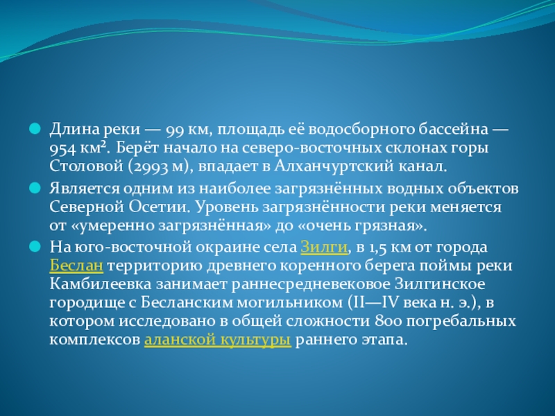 Река КамбилеевкаКамбилеевка река в Пригородном районе Северной Осетии; берет начало на северо-восточных склонах г.Столовой (2993м), впадает в