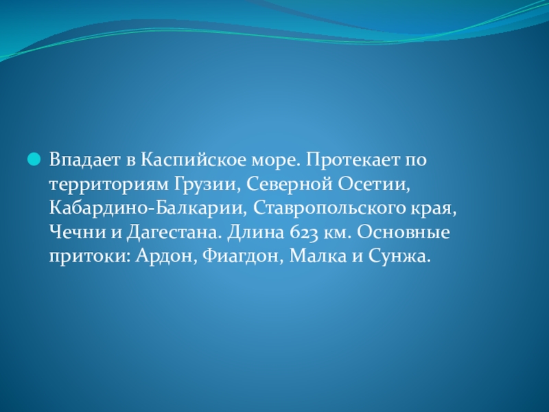 Ставропольского края, Чечни и Дагестана. Длина 623 км. Основные притоки: Ардон, Фиагдон, Малка и Сунжа.
