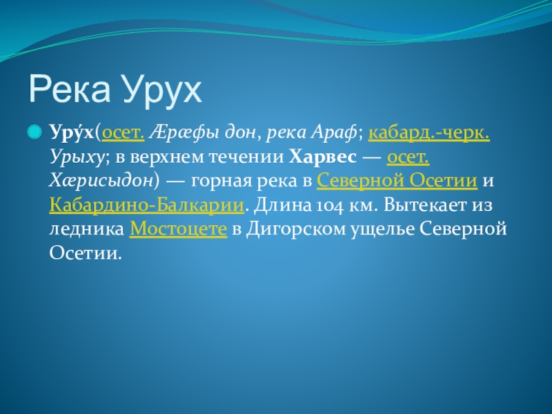 Река УрухУру́х(осет. Æрæфы дон, река Араф; кабард.-черк. Урыху; в верхнем течении Харвес — осет. Хæрисыдон) — горная река в