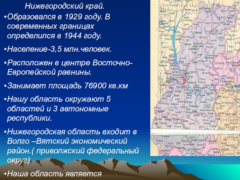 Нижегородский край.Образовался в 1929 году. В современных границах определился в 1944 году.Население-3,5 млн.человек.