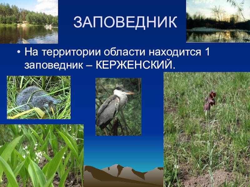 ЗАПОВЕДНИКНа территории области находится 1 заповедник – КЕРЖЕНСКИЙ.