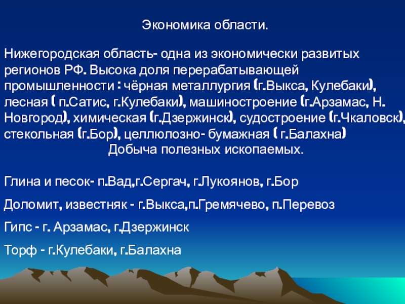 Нижегородская область- одна из экономически развитых регионов РФ. Высока доля перерабатывающей промышленности : чёрная металлургия (г.Выкса, Кулебаки), лесная ( п.Сатис, г.Кулебаки), машиностроение (г.Арзамас, Н.Новгород), химическая (г.Дзержинск), судостроение (г.Чкаловск), стекольная (г.Бор), целлюлозно- бумажная ( г.Балахна)