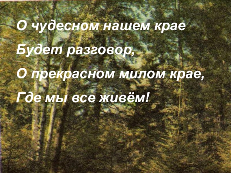 О чудесном нашем крае Будет разговор,О прекрасном милом крае,Где мы все живём!