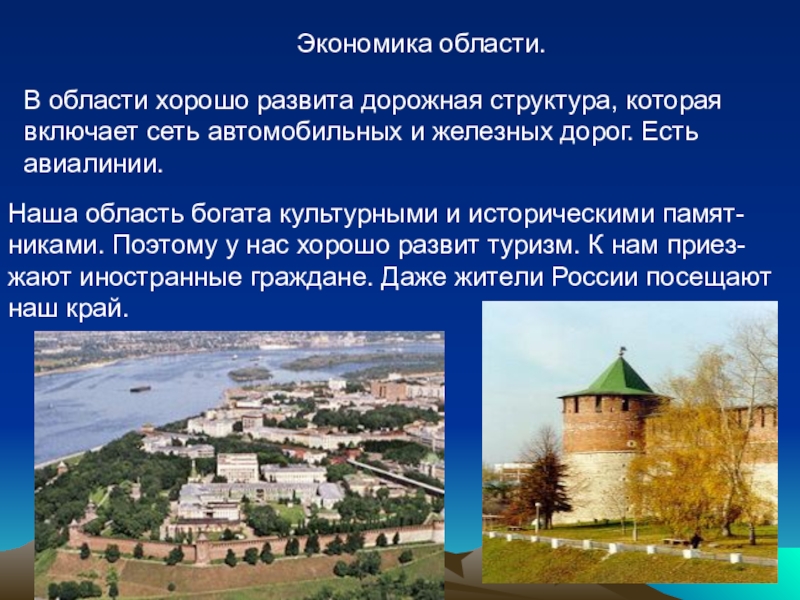 Наша область богата культурными и историческими памят-никами. Поэтому у нас хорошо развит туризм. К нам приез-жают иностранные граждане. Даже жители России посещают наш край.