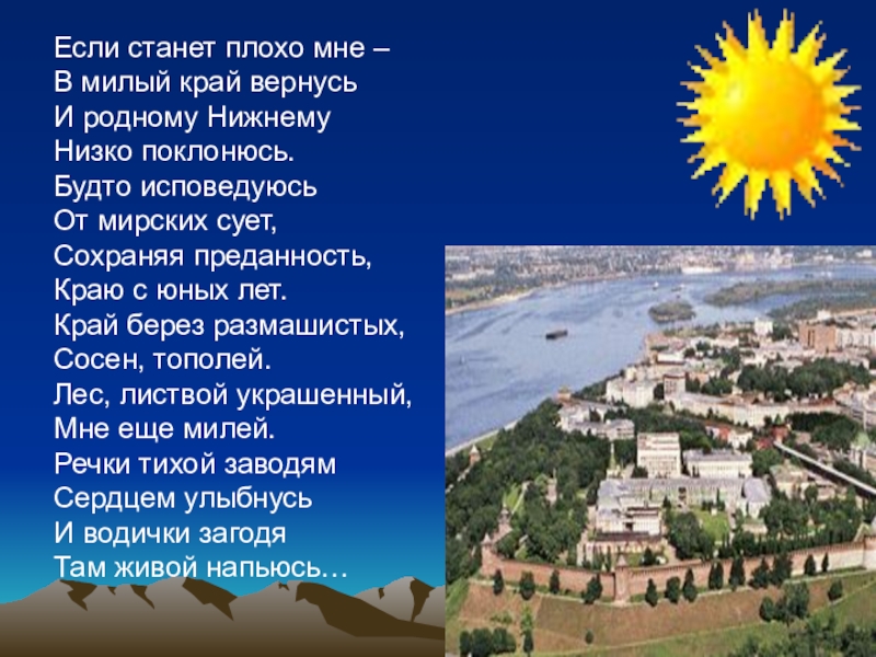 Слайд 16Если станет плохо мне – В милый край вернусь И родному Нижнему Низко поклонюсь. Будто