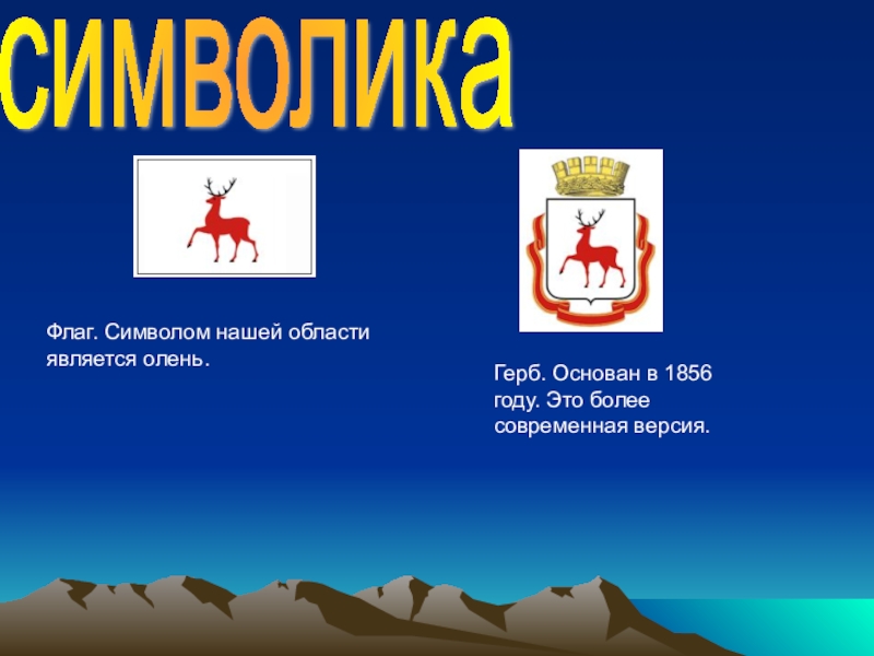 символикаФлаг. Символом нашей области является олень.Герб. Основан в 1856 году. Это более современная версия.