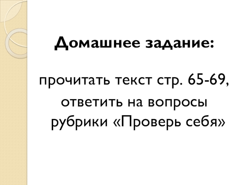 Домашнее задание:прочитать текст стр. 65-69,ответить на вопросы рубрики «Проверь себя»