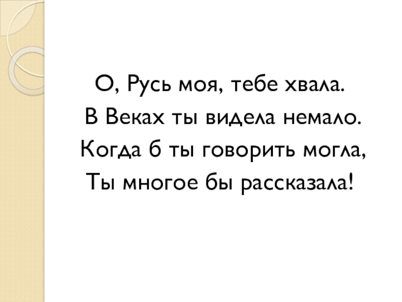 О, Русь моя, тебе хвала. В Веках ты видела немало. Когда б ты говорить могла,Ты многое бы рассказала!