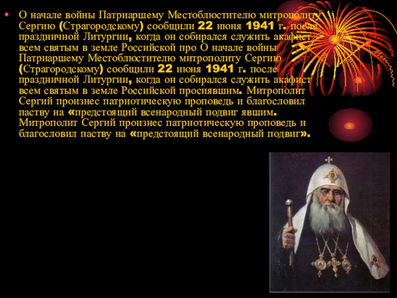 1941 г. после праздничной Литургии, когда он собирался служить акафист всем святым в земле Российской про О начале войны Патриаршему Местоблюстителю митрополиту Сергию (Страгородскому) сообщили 22 июня 1941 г. после праздничной Литургии, когда он собирался служить акафист всем святым в земле Российской просиявшим. Митрополит Сергий произнес патриотическую проповедь и благословил паству на «предстоящий всенародный подвиг явшим. Митрополит Сергий произнес патриотическую проповедь и благословил паству на «предстоящий всенародный подвиг».
