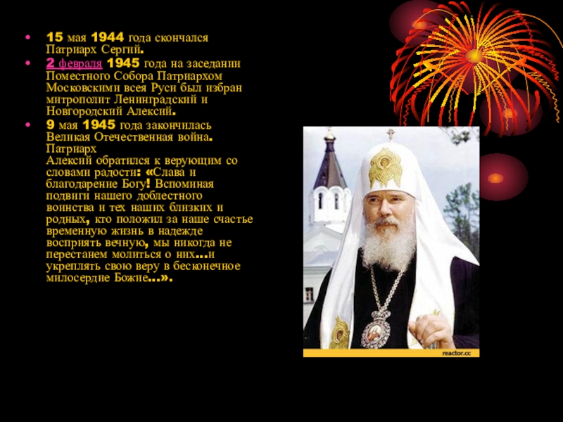 Слайд 3015 мая 1944 года скончался Патриарх Сергий.