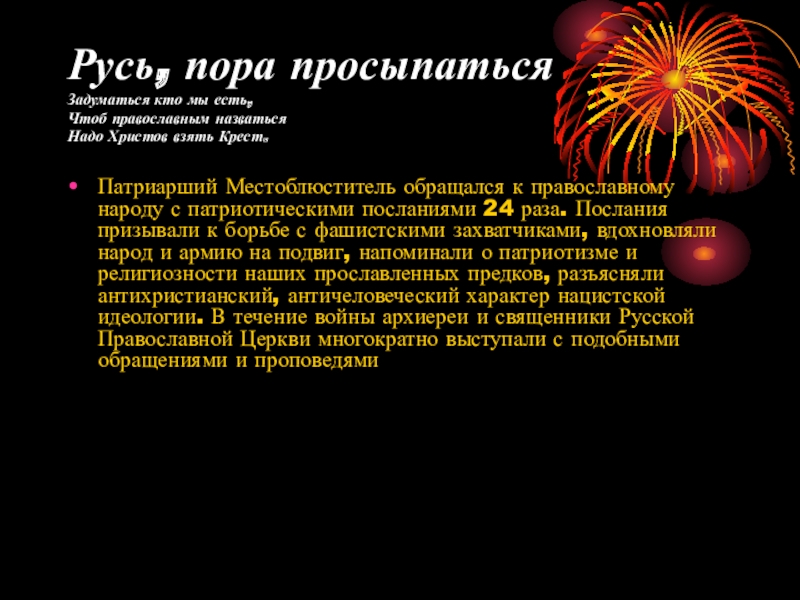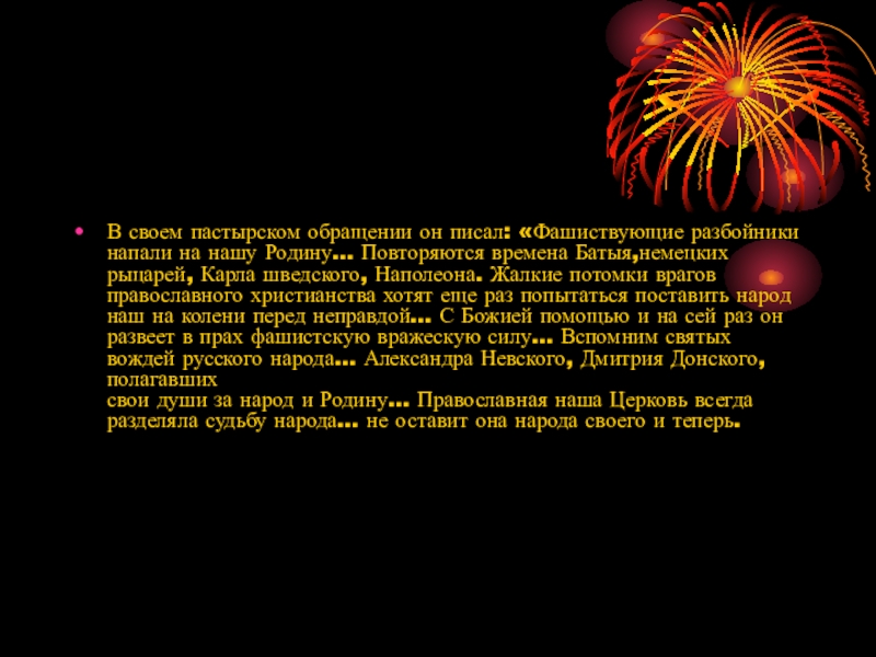 « ... Всему миру ясно, что фашистские изверги являются сатанинскими врагами веры и христианства. У русских людей, у всех, кому дорога наша Отчизна, сейчас одна цель - во что бы то ни стало одолеть врага».