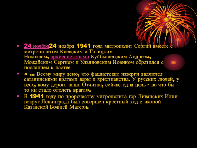 Слайд 724 ноября24 ноября 1941 года митрополит Сергий вместе с митрополитом Киевским и