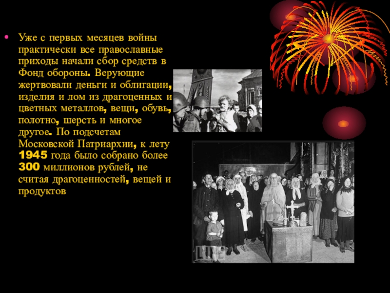 средств в Фонд обороны. Верующие жертвовали деньги и облигации, изделия и лом из драгоценных и цветных металлов, вещи, обувь, полотно, шерсть и многое другое. По подсчетам Московской Патриархии, к лету 1945 года было собрано более 300 миллионов рублей, не считая драгоценностей, вещей и продуктов
