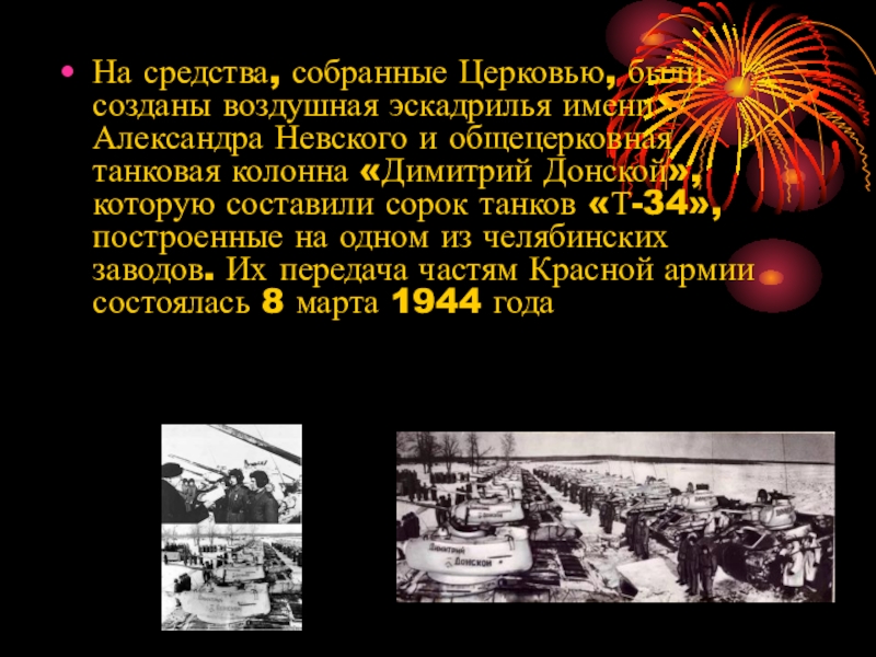 и общецерковная танковая колонна «Димитрий Донской», которую составили сорок танков «Т-34», построенные на одном из челябинских заводов. Их передача частям Красной армии состоялась 8 марта 1944 года