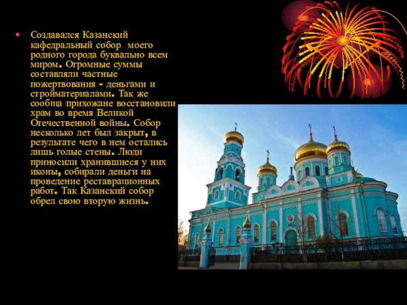 Слайд 28Создавался Казанский кафедральный собор моего родного города буквально всем миром. Огромные