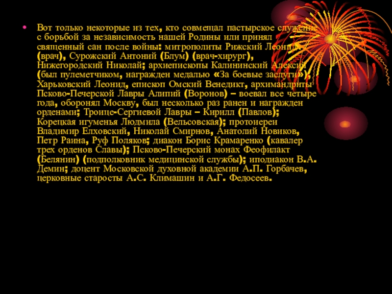 за независимость нашей Родины или принял священный сан после войны: митрополиты Рижский Леонид (врач), Сурожский Антоний (Блум) (врач-хирург), Нижегородский Николай; архиепископы Калининский Алексий (был пулеметчиком, награжден медалью «За боевые заслуги»), Харьковский Леонид, епископ Омский Венедикт, архимандриты Псково-Печерской Лавры Алипий (Воронов) – воевал все четыре года, оборонял Москву, был несколько раз ранен и награжден орденами; Троице-Сергиевой Лавры – Кирилл (Павлов); Корецкая игуменья Людмила (Вельсовская); протоиереи Владимир Елховский, Николай Смирнов, Анатолий Новиков, Петр Раина, Руф Поляков; диакон Борис Крамаренко (кавалер трех орденов Славы); Псково-Печерский монах Феофилакт (Белянин) (подполковник медицинской службы); иподиакон В.А. Демин; доцент Московской духовной академии А.П. Горбачев, церковные старосты А.С. Климашин и А.Г. Федосеев.