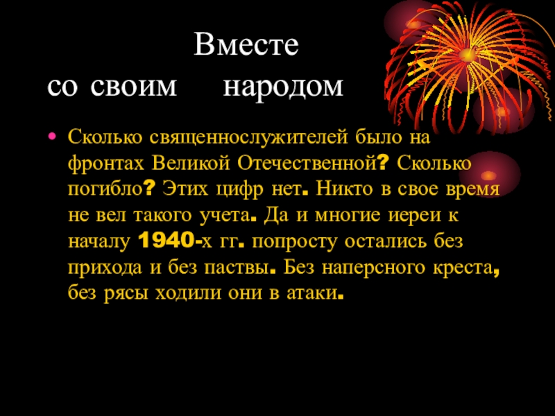 Слайд 11Трудно перечислить все виды патриотической деятельности духовенства во время войны. В
