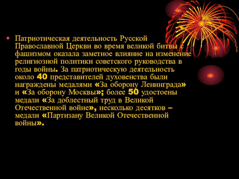 Слайд 29Патриотическая деятельность Русской Православной Церкви во время великой битвы с фашизмом