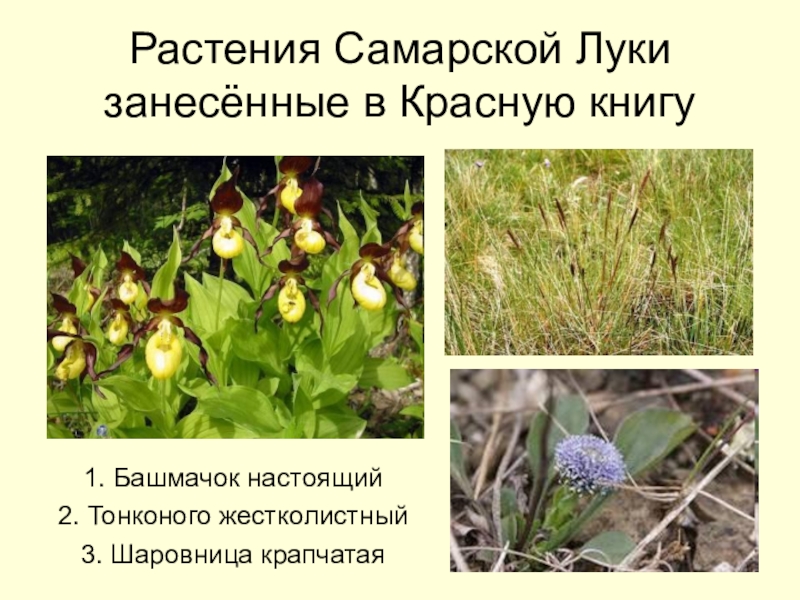 Растения Самарской Луки занесённые в Красную книгу1. Башмачок настоящий2. Тонконого жестколистный3. Шаровница крапчатая