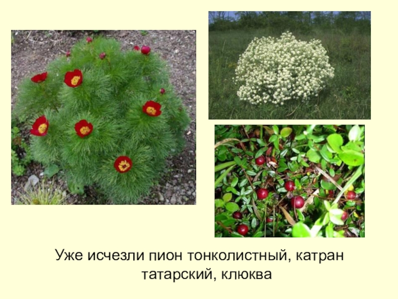 Слайд 15Уже исчезли пион тонколистный, катран татарский, клюква