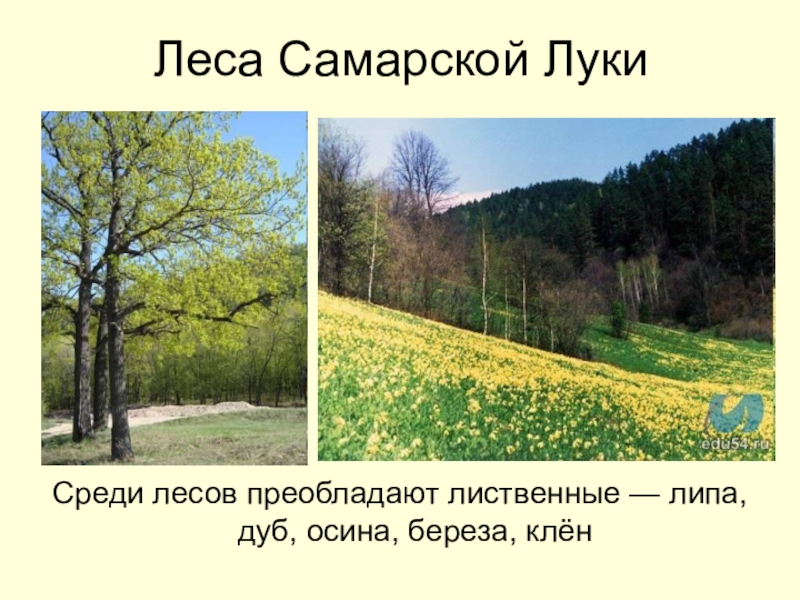 Леса Самарской ЛукиСреди лесов преобладают лиственные — липа, дуб, осина, береза, клён
