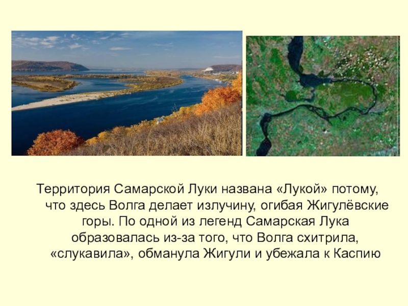 Слайд 4Территория Самарской Луки названа «Лукой» потому, что здесь Волга делает излучину,