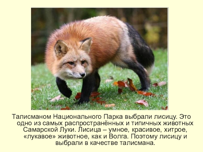 Талисманом Национального Парка выбрали лисицу. Это одно из самых распространённых и типичных животных Самарской Луки. Лисица –