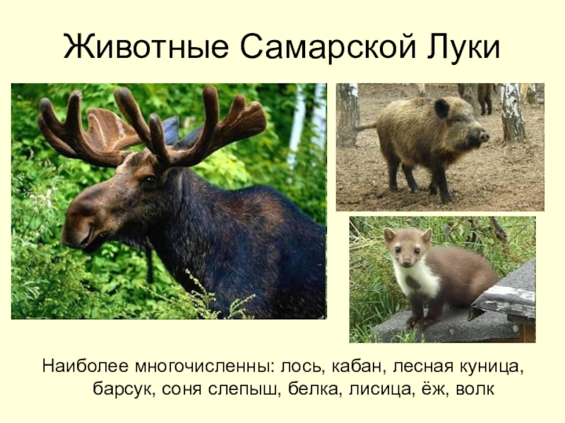 Животные Самарской ЛукиНаиболее многочисленны: лось, кабан, лесная куница, барсук, соня слепыш, белка, лисица, ёж, волк