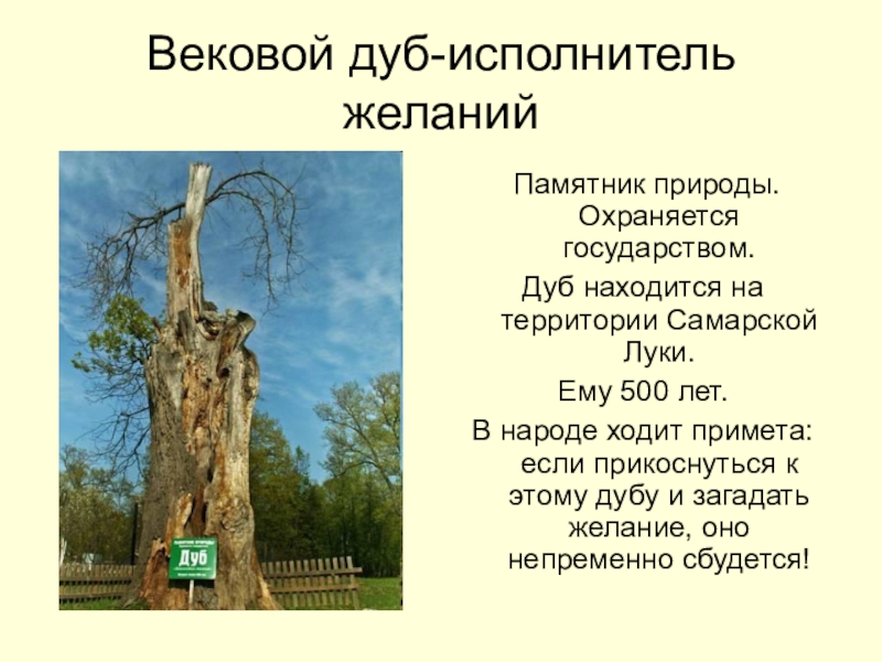 Вековой дуб-исполнитель желаний Памятник природы. Охраняется государством.Дуб находится на территории Самарской Луки. Ему 500 лет. В народе