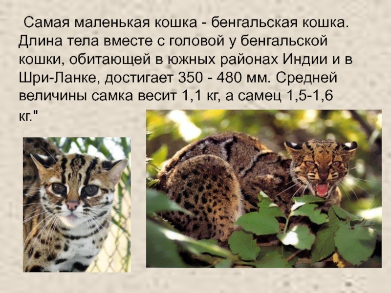 у бенгальской кошки, обитающей в южных районах Индии и в Шри-Ланке, достигает 350 - 480 мм. Средней величины самка весит 1,1 кг, а самец 1,5-1,6 кг."