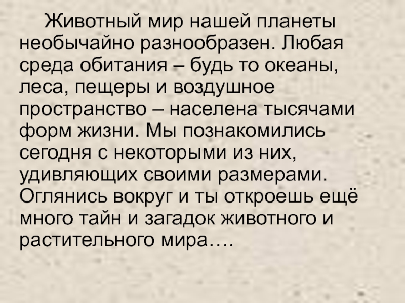 то океаны, леса, пещеры и воздушное пространство – населена тысячами форм жизни. Мы познакомились сегодня с некоторыми из них, удивляющих своими размерами. Оглянись вокруг и ты откроешь ещё много тайн и загадок животного и растительного мира….